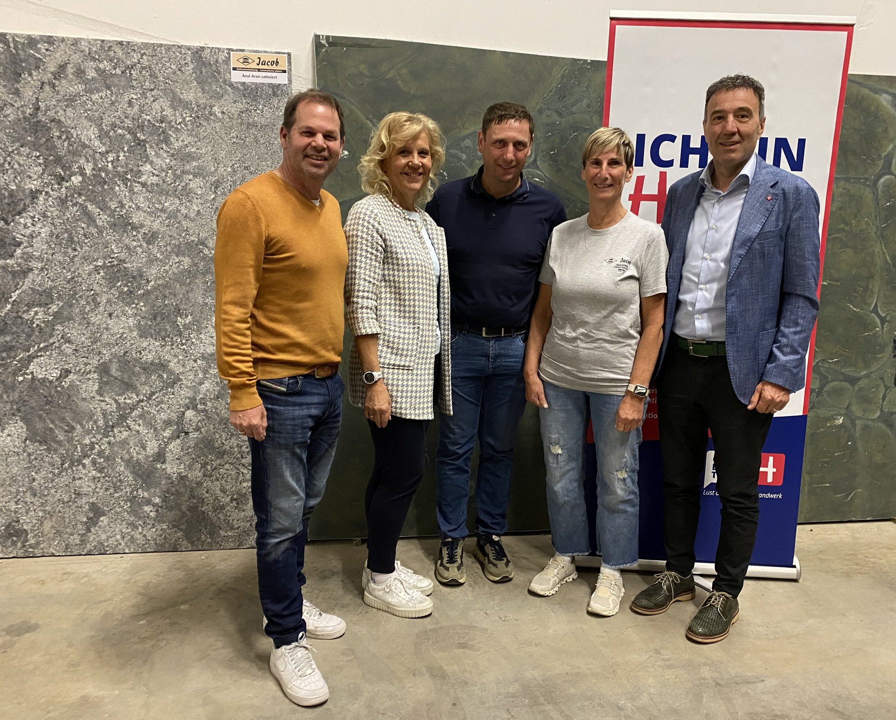 Nella foto (da sinistra): Hannes Mussak (Vicepresidente di lvh.apa), Angelika Wiedmer (membro del Consiglio direttivo di lvh.apa), Mathias Piazzi (Presidente del circondario Burgraviato di lvh.apa), Doris Jacob (azienda di scalpellini Jacob) e Walter Pöhl Direttore di lvh.apa) – Foto © lvh.apa