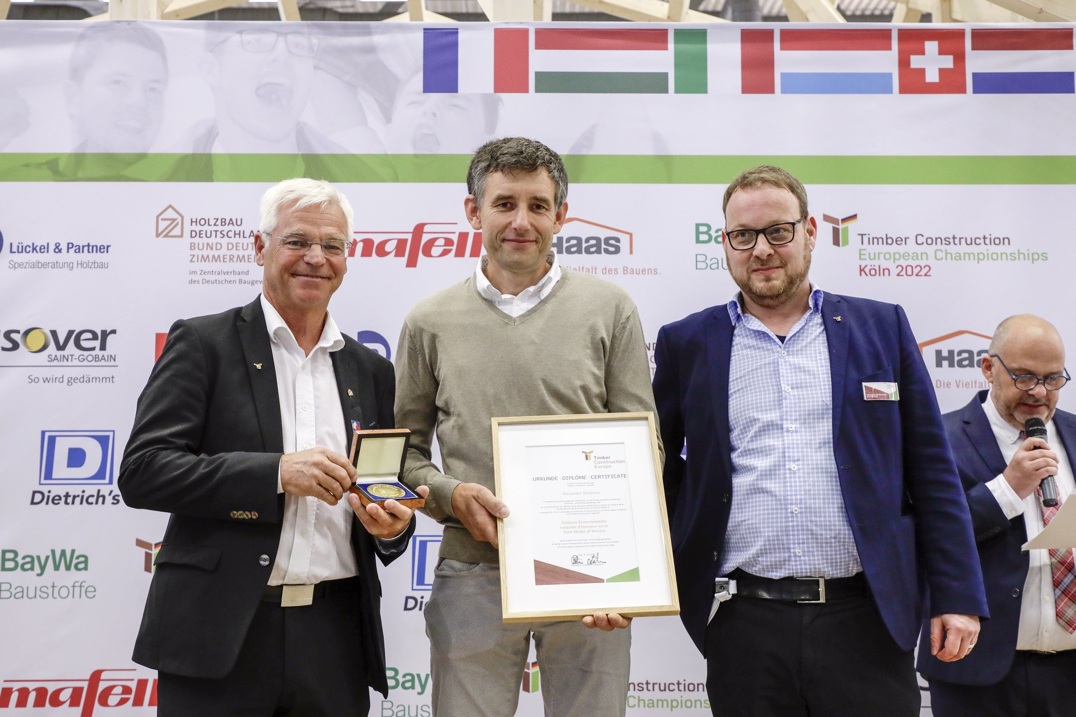 Der Zimmermeister und langjährige Chefexperte der Europameisterschaft der Zimmerer, Alexander Schötzer, wurde im Rahmen der Timber Construction European Championships im Juli 2022 in Köln für seine hervorragenden Verdienste um die Förderung des europäischen Zimmerer- und Holzbaugewerbes geehrt. Peter Aicher, Präsident von Timber Construction Europe, überreichte ihm die Goldene Medaille der europäischen Vereinigung des Holzbaus und bedankte sich bei Alexander Schötzer für sein langjähriges Engagement. Als Chefexperte habe er, so Aicher, viele Male seine Fachkenntnis des Zimmererhandwerks eingebracht, um eine fundierte und faire Entscheidung über die Gewinner der Europameisterschaft zu gewährleisten. Auch lvh-Präsident Martin Haller gratuliert: „Das Engagement und die Begeisterung, die Alexander im Rahmen der Berufswettbewerbe mitbringt, ist enorm. Es freut uns sehr, dass er nun auch eine formelle Anerkennung für seine Leistung und seinen Einsatz erhalten hat.“ Auch der Berufsbeirat der Holzbaumeister und Zimmerer im lvh bedankt sich bei Schötzer für sein Engagement.