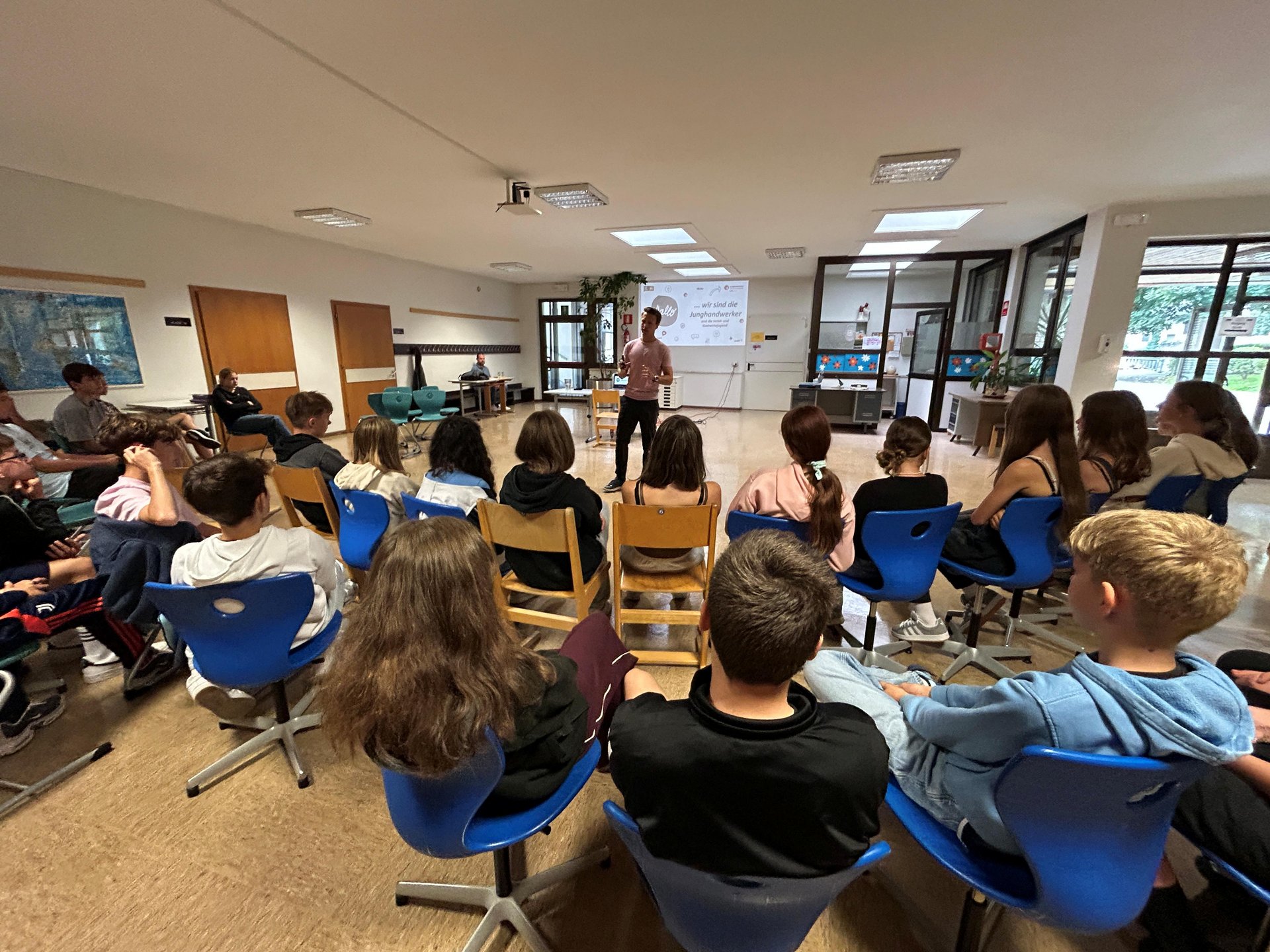 Der Vertreter der Junghandwerker/innen im lvh Elias Priller informierte die Schülerinnen und Schüler über die verschiedenen Berufe, die zahlreichen Ausbildungsmöglichkeiten und beruflichen Werdegänge im Handwerk. Über 400 verschiedene Berufe gibt es im Handwerk, genau deshalb ist es so wichtig, dass die Jugendlichen die Möglichkeit bekommen, so viele wie möglich davon kennenzulernen.