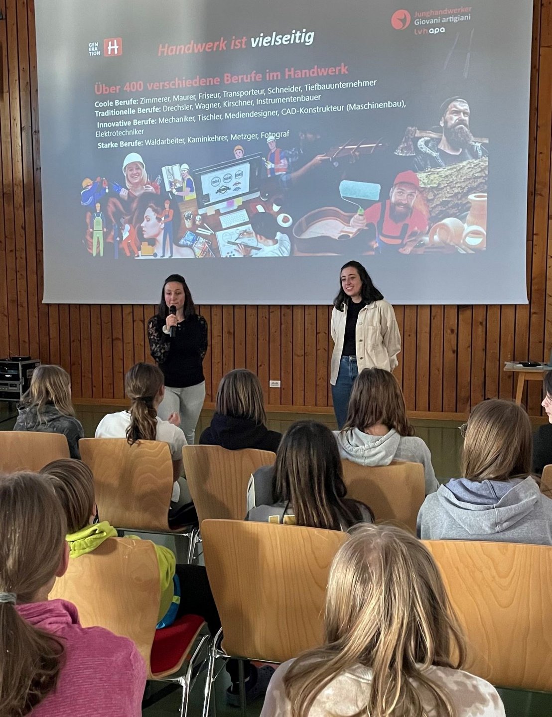 Im Rahmen der Berufsinformationskampagne „#yourchance!“ waren kürzlich Vertreterinnen der Junghandwerker im lvh und der Hoteliers- und Gastwirtejugend (HGJ) in der Mittelschule Deutschnofen zu Besuch.