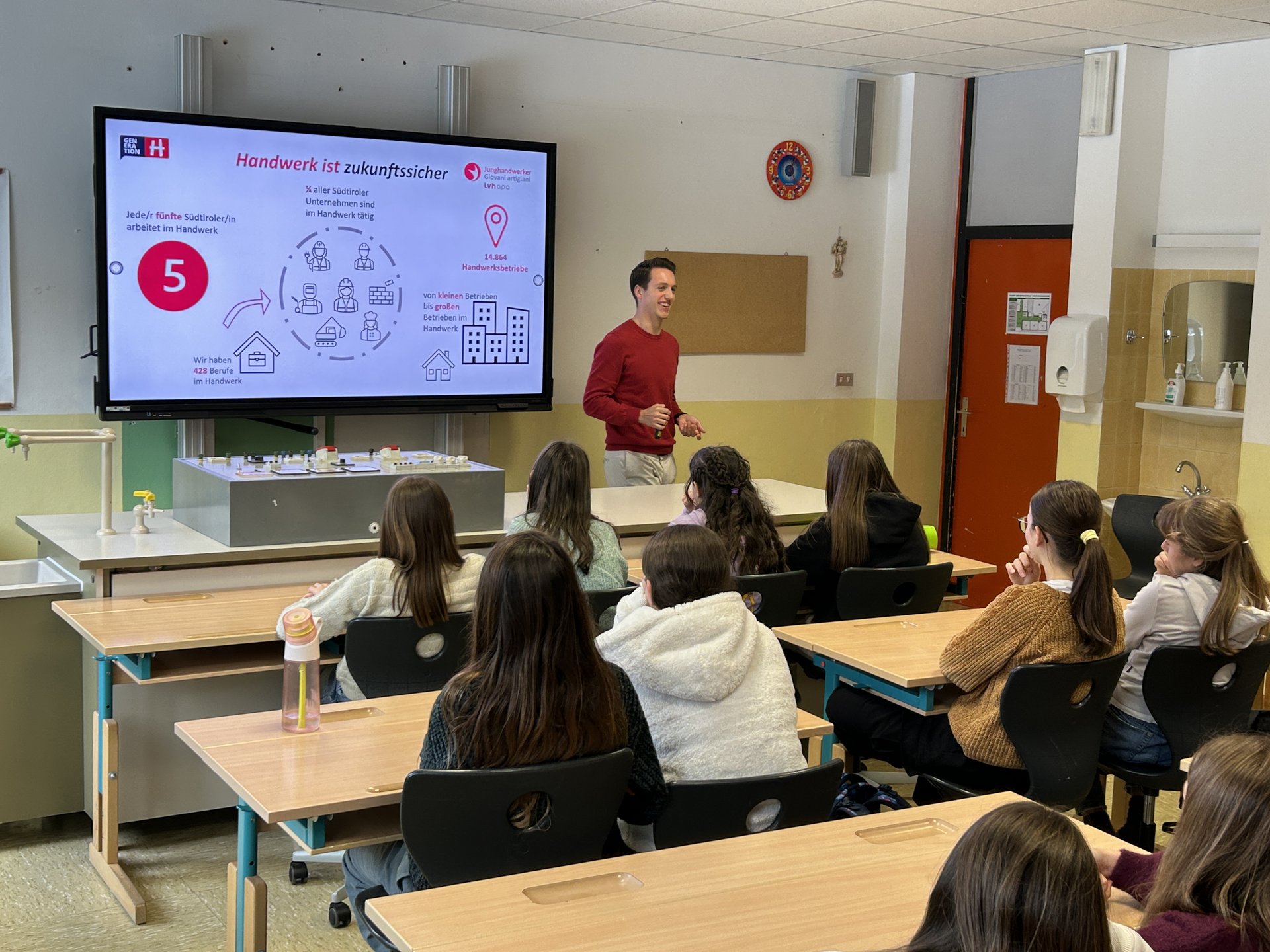 In St. Vigil in Enneberg war das Setting ein anderes – und doch ähnlich direkt. Hier ergänzte ??? von der HGJ den Vortrag im Klassenraum. Gemeinsam mit Priller entstand ein doppelter Blick auf die Arbeitswelt: Handwerk und Gastgewerbe, Kopf und Hand, Atelier und Hotel.