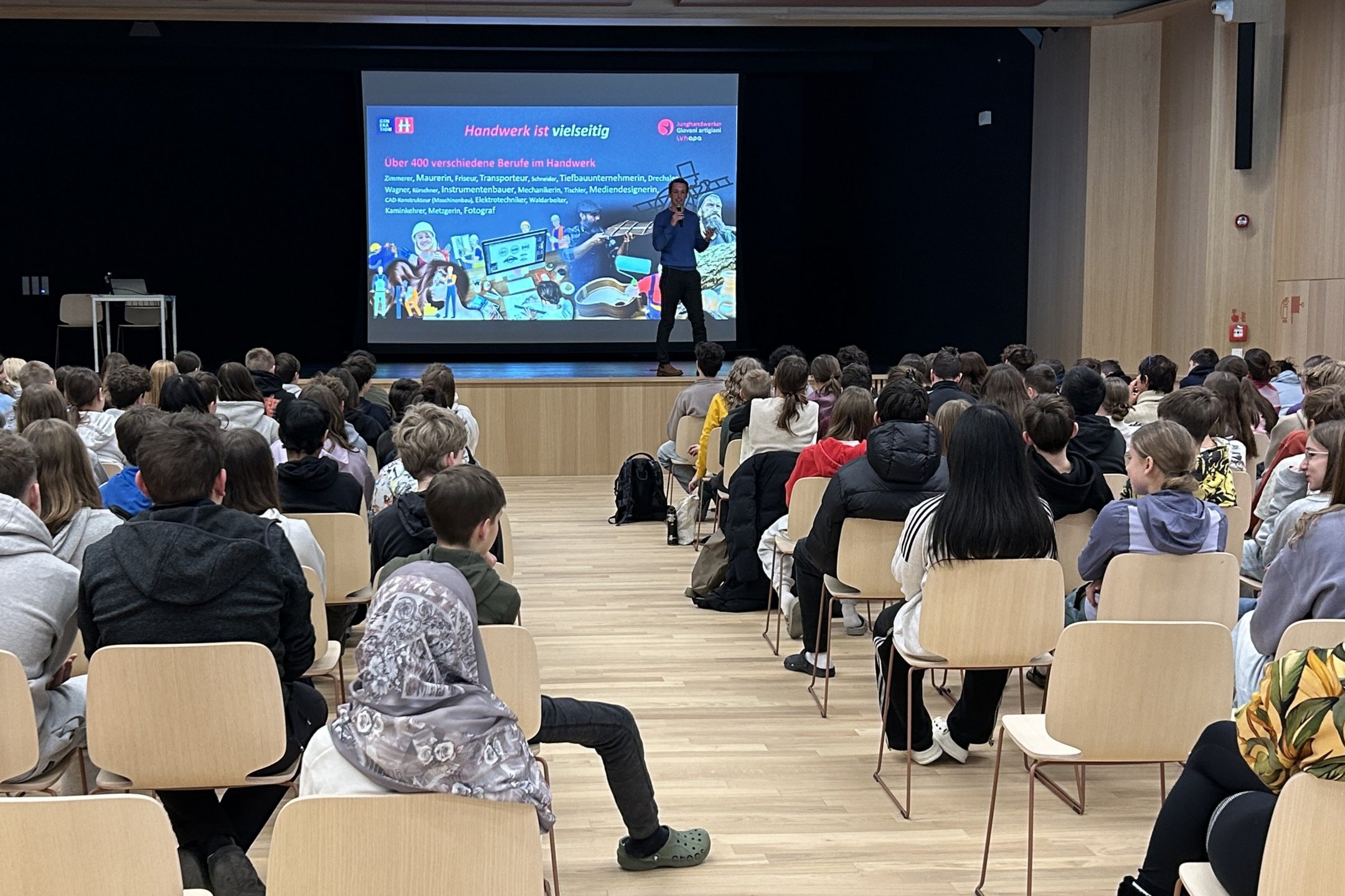 Bei einem Vortrag vor acht dritten Mittelschulklassen in Sterzing zeigte Elias Priller, Koordinator der Junghandwerker/innen im lvh, wie breit die Möglichkeiten im Handwerk heute sind. Über 60 verschiedene Berufe eröffnen Jugendlichen echte Zukunftsperspektiven – gerade in einer Zeit, in der qualifizierte Fachkräfte gefragter sind denn je. Priller machte deutlich, dass das Handwerk nicht nur vielfältig, sondern auch stabil, praxisnah und voll attraktiver Karrierechancen ist.
