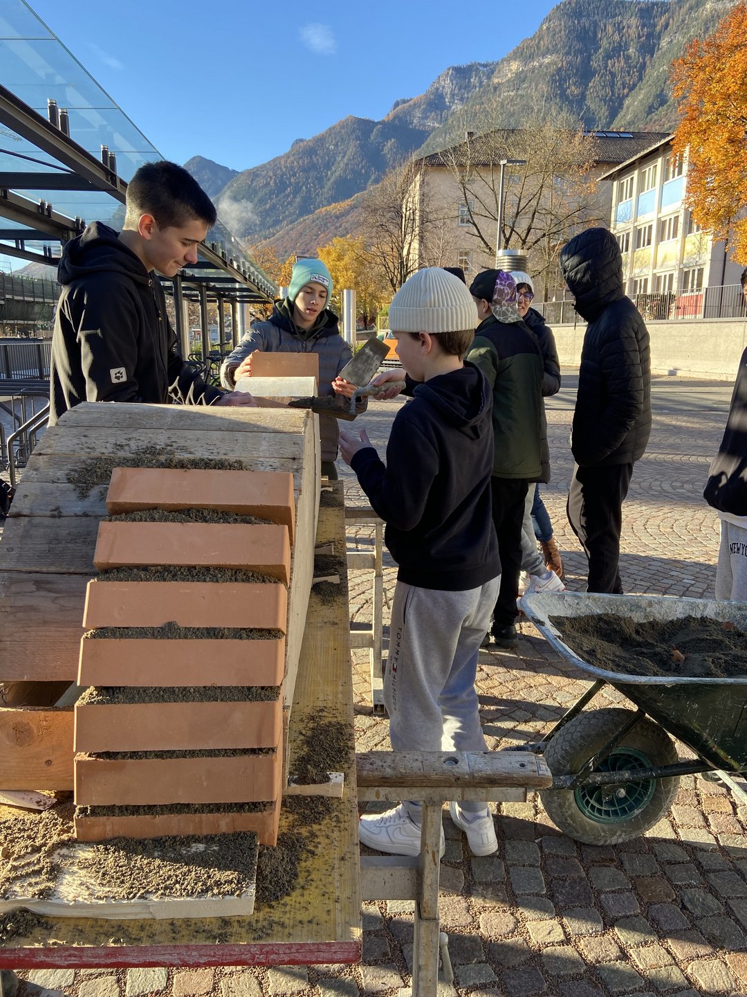 Die Berufsschule Meran kam mit zwei Schüler/innen und einer großen Tasche voll mit Utensilien in die Mittelschule Kaltern, um dort eine Maniküre und andere Behandlungen durchzuführen. Im Schulhof haben sich die Maurer von German Hauser eingerichtet, die Schüler/innen stellten gemeinsam eine Mauer auf.