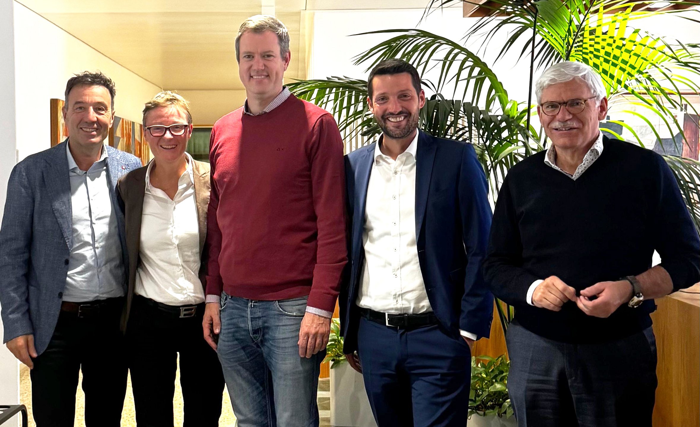 Im Bild (v.l.n.r.): Walter Pöhl (lvh-Direktor), Ester Demetz (lvh- Büroleiterin Berufe und Bezirke), Martin Haller (lvh-Präsident), Dominik Oberstaller (Präsident Gemeindenverband) und Benedikt Galler (Direktor Gemeindenverband) – Foto © Gemeindenverband
