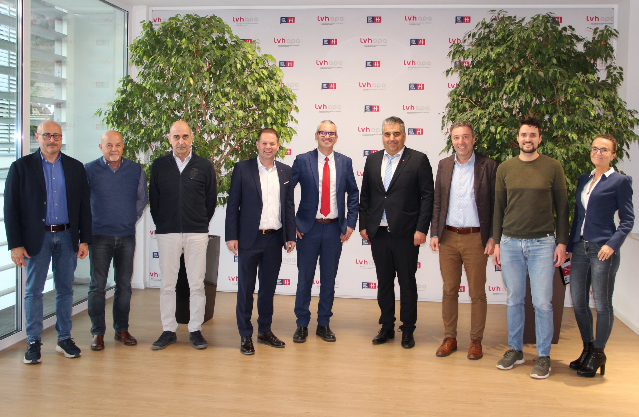 Im Bild (v.l.n.r.): Felice Espro (CNA Südtirol), Karl Aichner (Obmann Mietwagen CNA Südtirol), Claudio Gobbo (Vizepräsident Taxi Bozen), Hannes Mussak (lvh-Vizepräsident), Markus Kolhaupt (Amt für Mobilität, Provinz Bozen), Hansjörg Thaler (lvh-Obmann Mietwagenunternehmer/innen), Walter Pöhl (lvh-Direktor), Matthias Bernard (Ressort Infrastruktur und Mobilität, Fachbereich Transporte) und Zoia Reiterer (lvh-Koordinatorin Kompetenzbereich Berufe) – Foto © lvh.apa