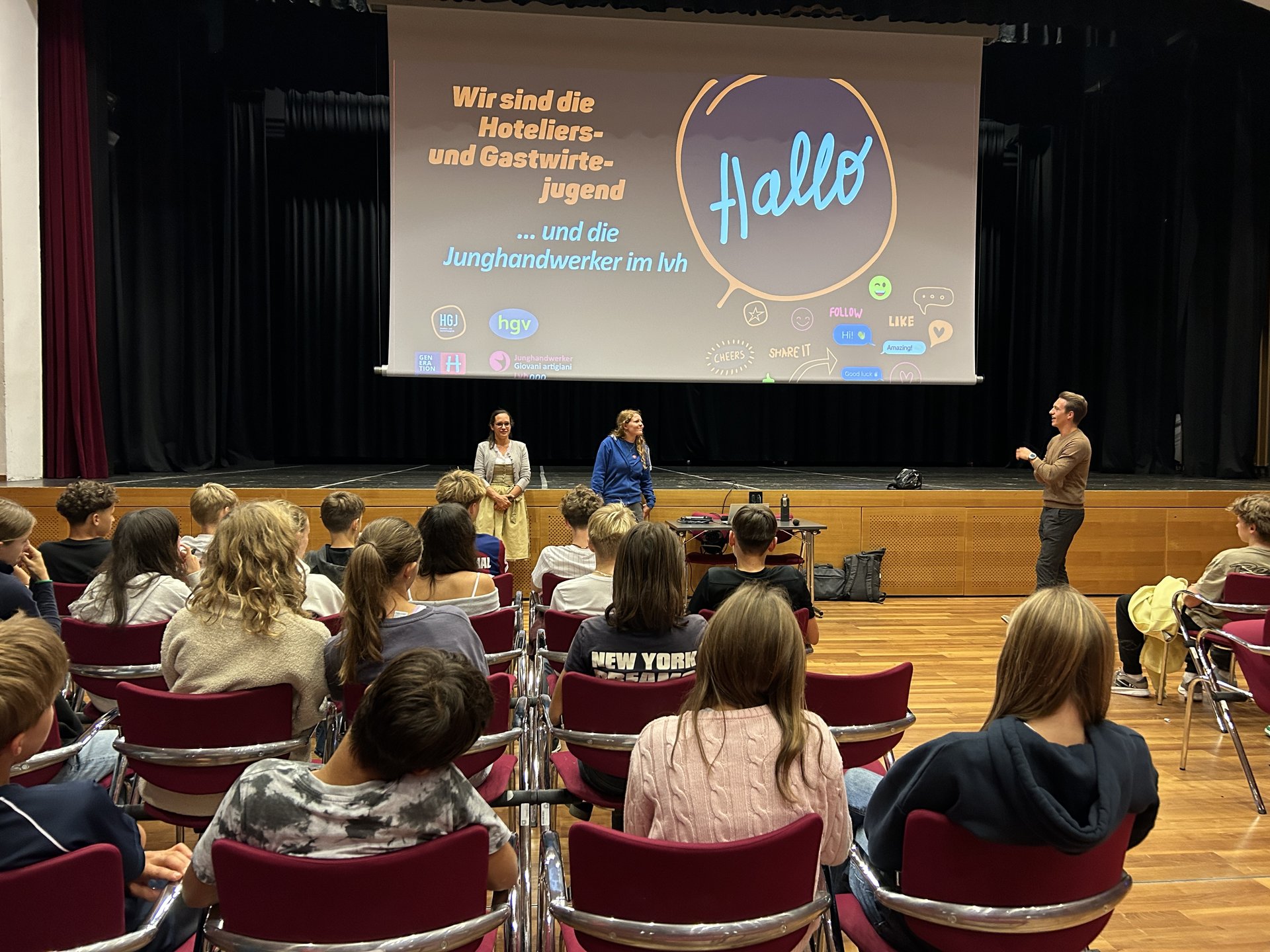 Holzhammer den sieben Klassen anhand einer interaktiven Präsentation an der Schule. Begleitet wurde sie von Michael Huber vom Bordeaux Keller in Eppan, welcher ebenso im Bezirksausschuss Bozen und Umgebung der HGJ mitwirkt. „Ich finde es besonders spannend, dass man im Hotel- und Gastgewerbe weltweite Arbeitsmöglichkeiten hat. Ich habe zum Beispiel selbst bereits Arbeitserfahrung in mehreren Betrieben in Südtirol, als auch in Australien und Frankreich sammeln dürfen“, so Michael Huber.