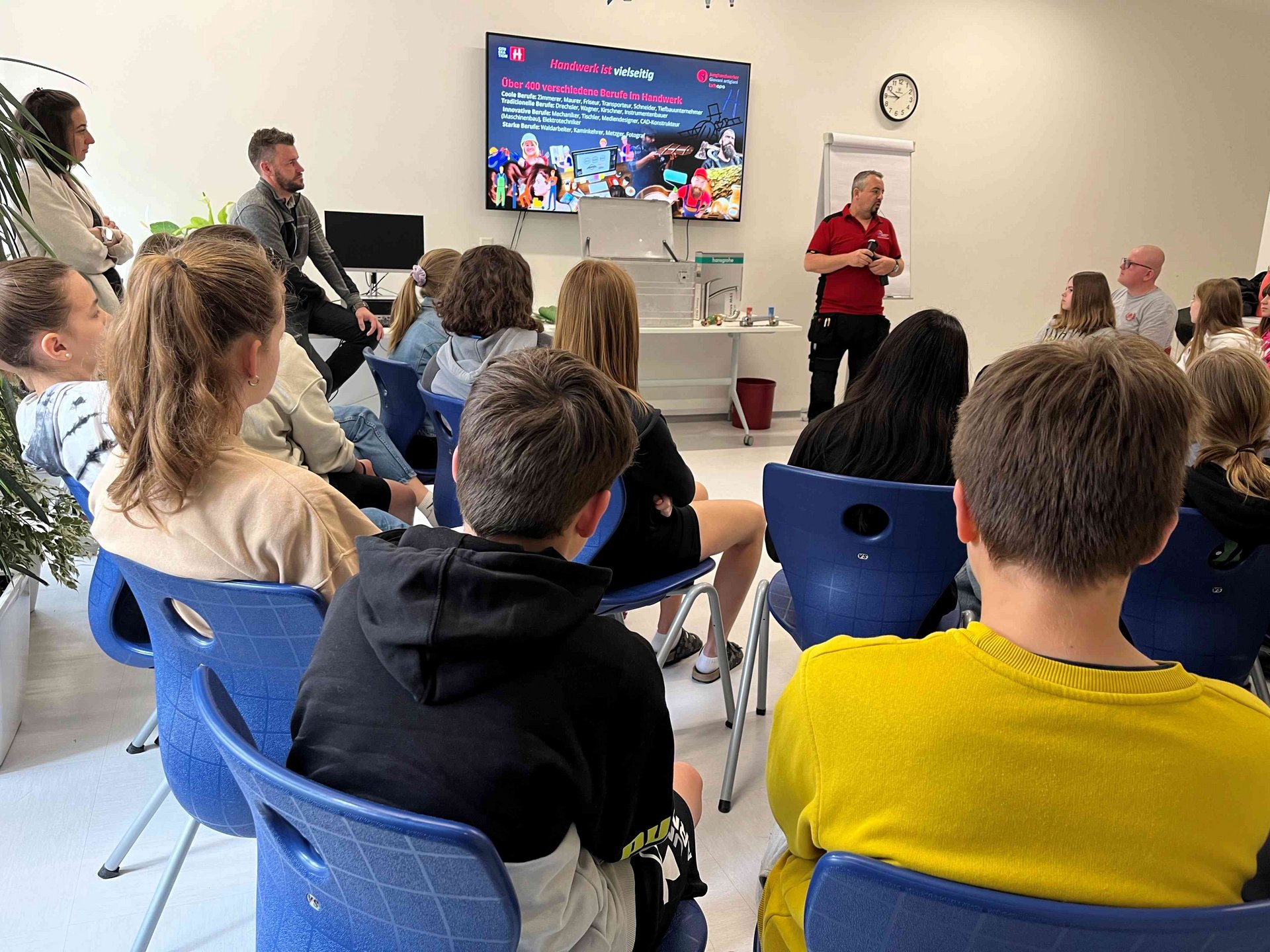Gemeinsam mit Stephan Hölzl, Firmeninhaber und Geschäftsführer von Rasenfix und mit Heizungs- Lüftungs- und Sanitäranlagentechniker Christian Prackwieser gaben die Junghandwerker den Mittelschüler/innen einen Einblick in die Welt der Handwerksberufe. Hölzl berichtete dabei, wie er zu seiner Tätigkeit kam und was ihm bei seiner täglichen Arbeit Freude bereitet: „Mein Beruf bereitet mir immer noch große Freude, da er sehr kreativ ist und ich sofort das Ergebnis meiner Arbeit sehen kann, auch ist es großartig zu sehen, was alles im Bereich der Landschaftsgärtner möglich ist“. Auch Prackwieser Christian erklärte den Jugendlichen anschaulich, wie er zu seinem Beruf gekommen ist und was die besonderen Herausforderungen sind. Dabei unterstrich er, wie sehr ihn die Flexibilität und die Abwechslung in seinem Beruf fasziniert.