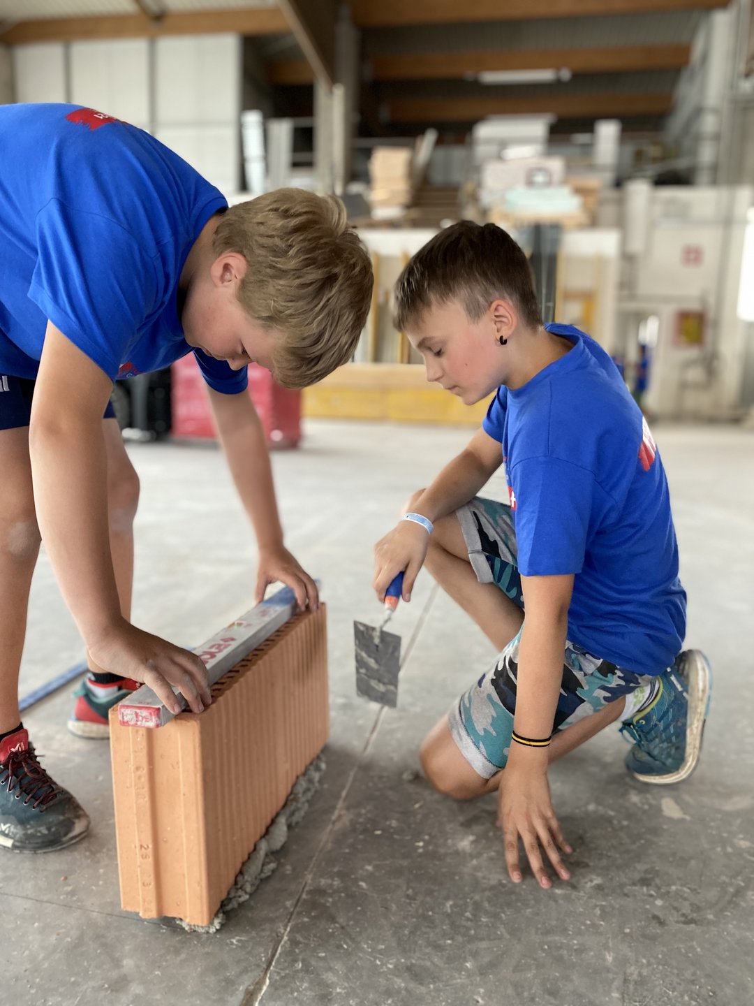 Mit Maurer und Berufsschullehrer Florian Weger wurden die nächsten zwei Wochen gestaltet. Unter dem Motto „Fleißige Baumeister“ haben die Kinder gemauert, gepinselt, gefliest und einen Dachstuhl zusammengebaut, sodass am Ende der zwei Wochen ein fertiges Häuschen entstanden ist, auf welches stolz geblickt wird. Maurer und Baumeister sowie Landesobmann der Junghandwerker Alexander Dallio war in Bruneck ebenfalls mit dabei. „Wir hoffen, wir konnten den Kindern ein besseres Verständnis für den Umgang mit Produkten auf den Weg geben und sie auch motivieren, selbst Hand anzulegen“, so Dallio.
