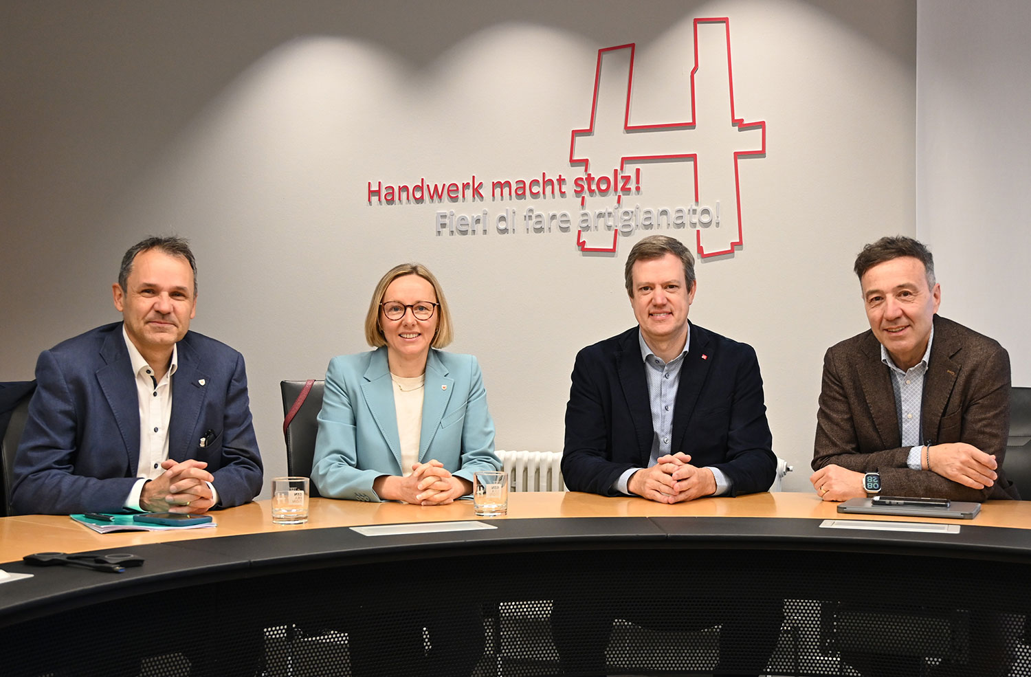 Im Bild (von links): Stefan Luther (Direktor Amt für Arbeitsmarktbeobachtung), Magdalena Amhof (Landesrätin), Martin Haller (lvh-Präsident) und Walter Pöhl (lvh-Direktor) – Foto © lvh.apa