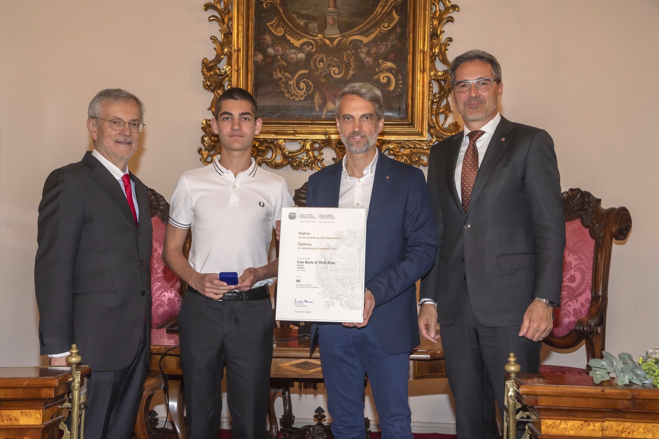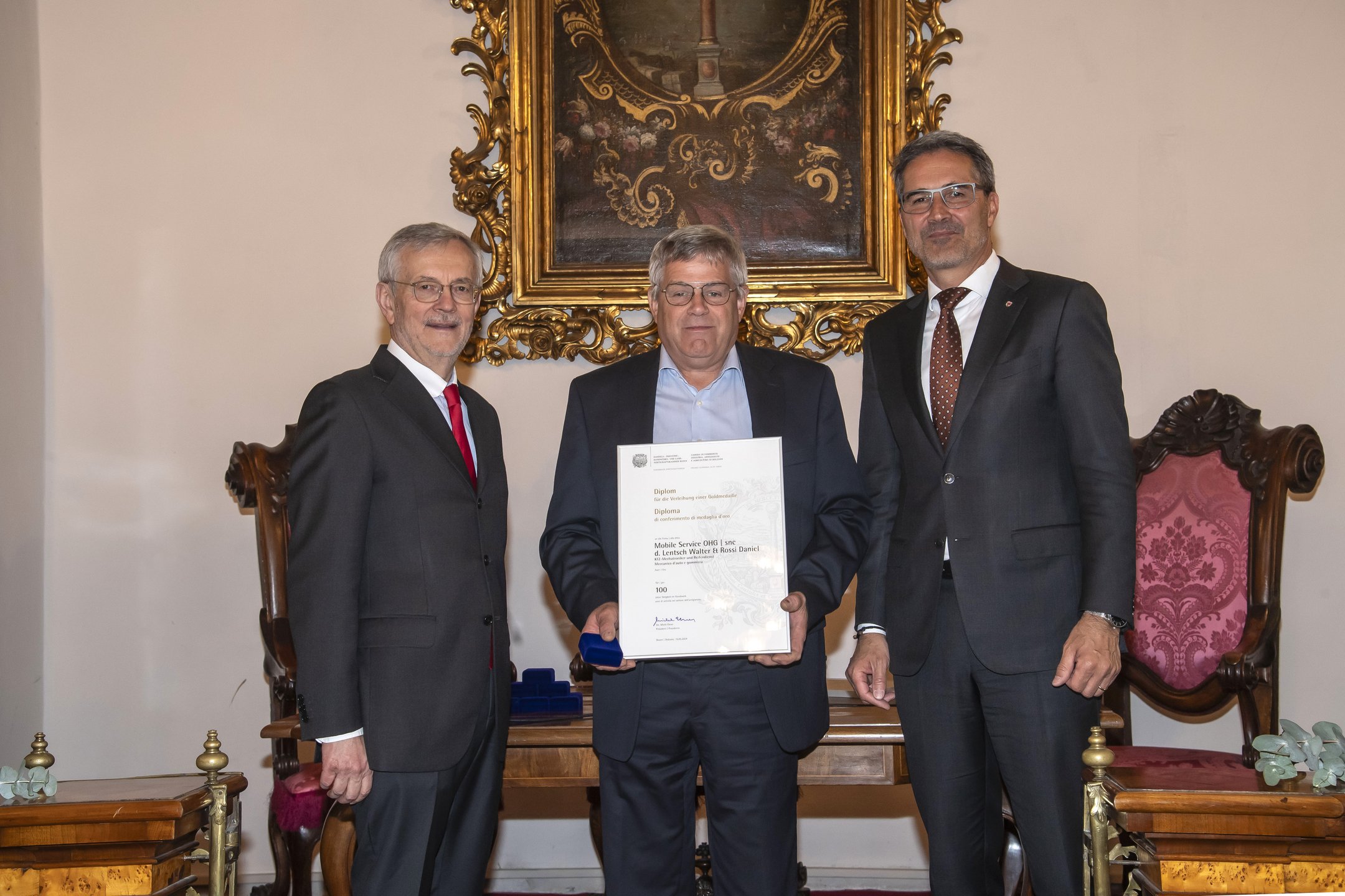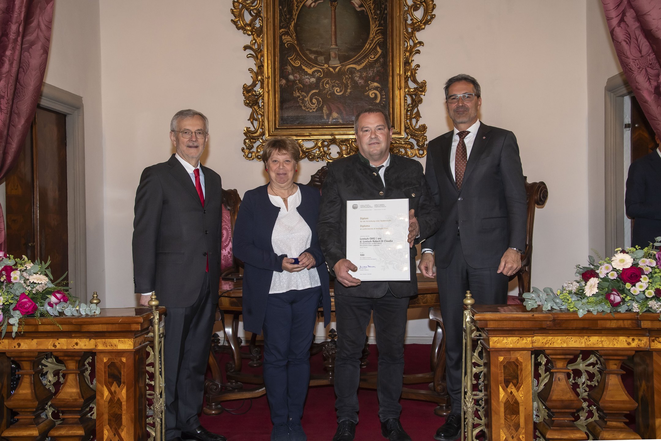 Im festlichen Rahmen des Merkantilgebäudes überreichten der Landeshauptmann Arno Kompatscher und der Präsident der Handelskammer Michl Ebner Goldmedaillen und Diplome an insgesamt 15 traditionsreiche Südtiroler Unternehmen. Die ausgezeichneten Betriebe weisen zwischen 50 und 250 Jahre Tätigkeit auf.