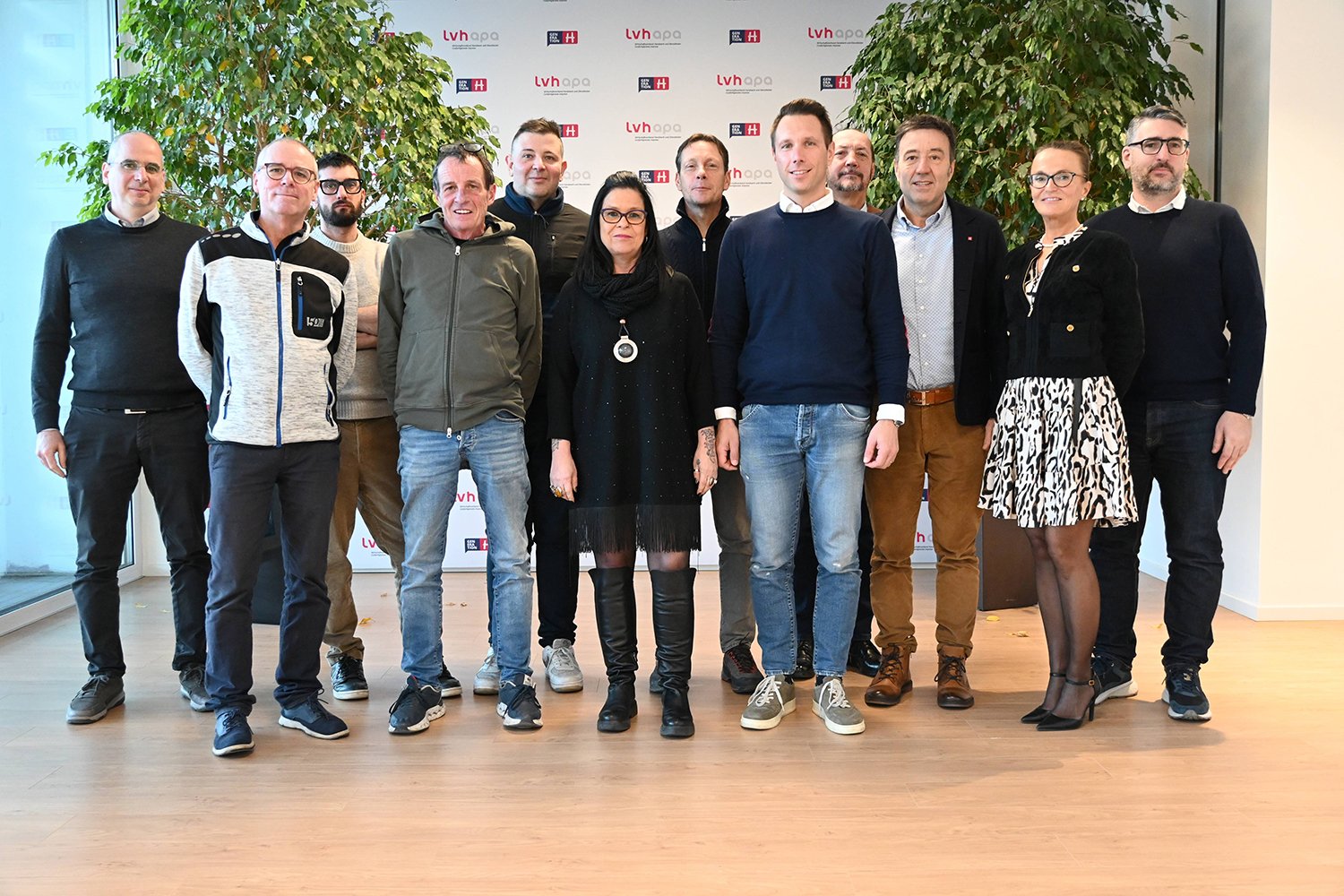 Im Bild (von links): Marco Nobile (lvh), Stefano Schwarze (Fillea CGIL-AGB), Alexander Freiberger (Fillea CGIL-AGB); Georg Plaickner (SGB-CISL); Patrizio Serra (ASBG); Sylvia Gall (FILCA-SGB/CISL); Michele Pavan (Feneal UIL-SGK); Fritz Ploner (lvh.apa); Werner Blaas (ASGB); Walter Pöhl (lvh.apa); Zoia Reiterer (lvh.apa) und Matteo Salvetti (Feneal UIL-SGK) – Foto © lvh.apa