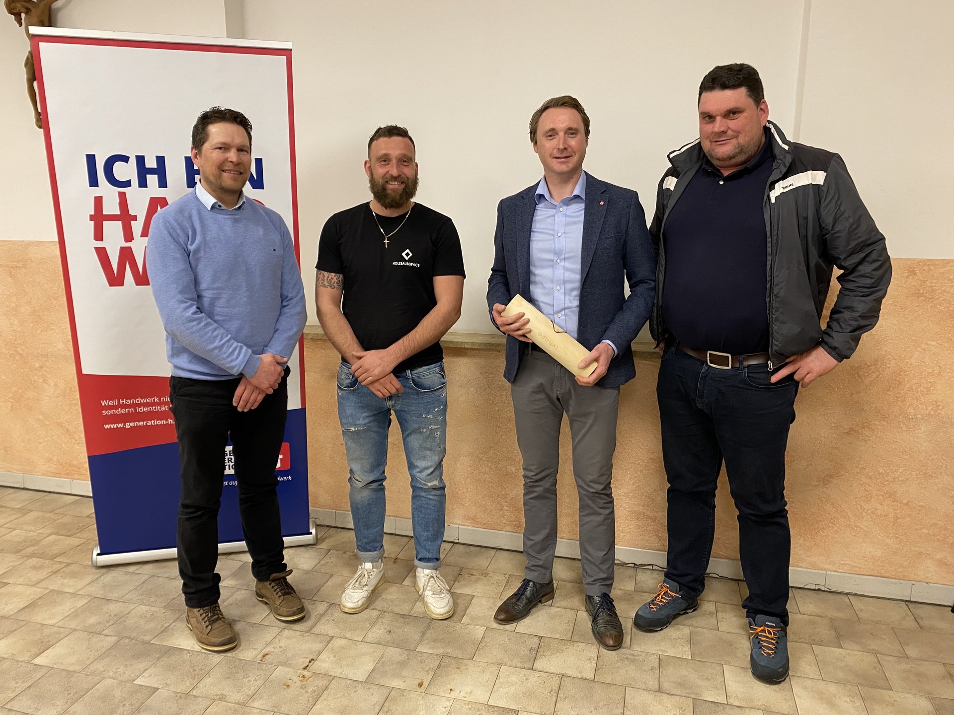 Im Bild (v.l.n.r.): Davide Complojer (lvh-Bezirksobmann), Lukas Leimegger (lvh-Ortsobmann), Ulrich Weger (scheidender Ortsobmann) und Matthias Falkensteiner (Gemeindereferent) – Foto © lvh.apa